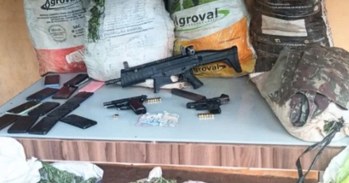 Durante a ação, foram apreendidos oito veículos, 11 aparelhos celulares, três armas de fogo [entre elas uma submetralhadora calibre .40] e 14 sacos de contendo maconha.